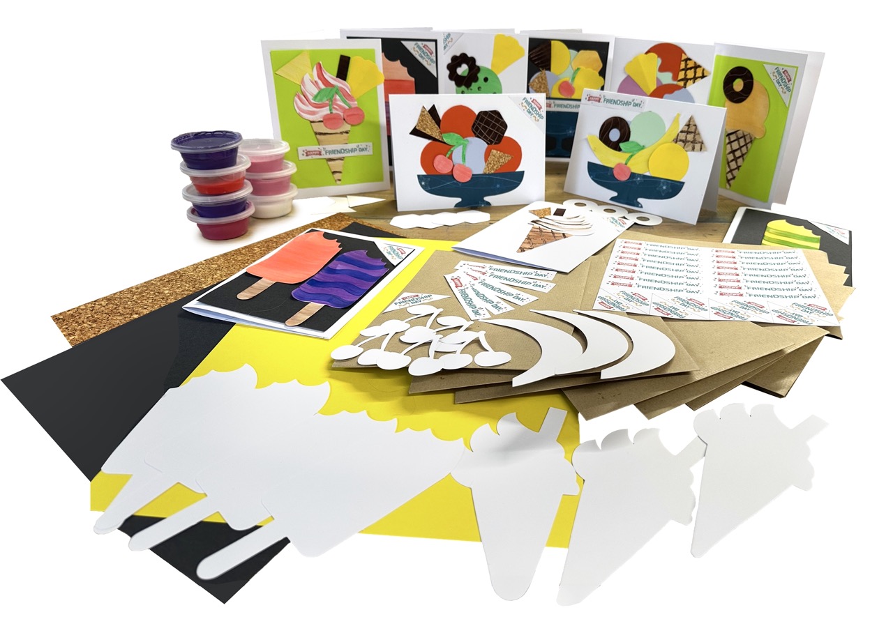 Create these cheerful and bright cards to gift to friends and family. Paint and make your favourite ice-cream Sundaes and Banana splits.